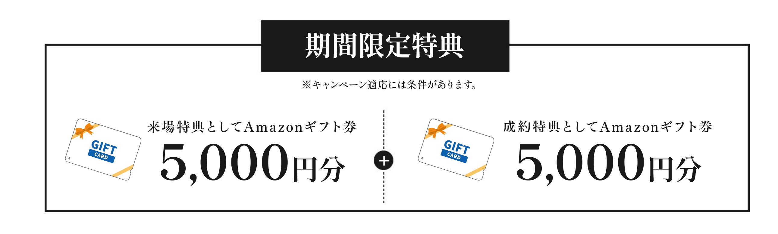 ご来場特典として、Amazonギフト券 5,000円分、成約特典としてAmazonギフト券 5,000円分プレゼント!