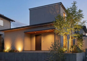 高い断熱性能を持つダブル断熱の外壁に、深みのあるグレーの塗り壁を纏わせました。職人の手による繊細なテクスチャーが既製品にはない豊かな表情と存在感を放ちます。外構の植栽と相まって、「洗練」と「自然」が共鳴する心地よい住まいを演出します。